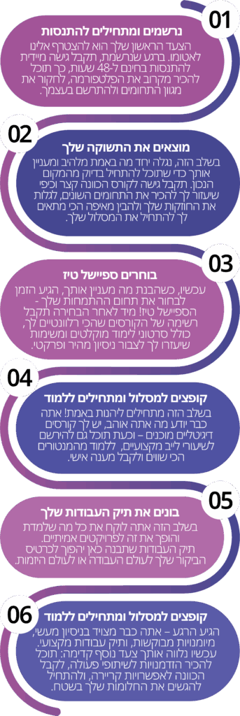 אל דאגה – גם אם עדיין לא ברור לך מה באמת מתאים לך, בתוך המערכת יש לנו קורס מיוחד שיעזור לך לגלות בדיוק מה התחום שהכי מדליק אותך ואיך להתחיל נכון.